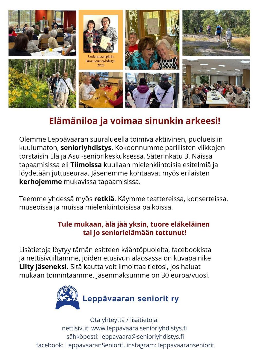 Leppävaaran seniorit ry on rekisteröity, puolueisiin kuulumaton yhdistys. Se on Kansallisen senioriliiton ja Uudenmaan Kansallinen Senioripiiri ry:n jäsenyhdistys. Olemme myös Espoon Eläkeläisten keskusliitto ry:n aktiivinen jäsen.