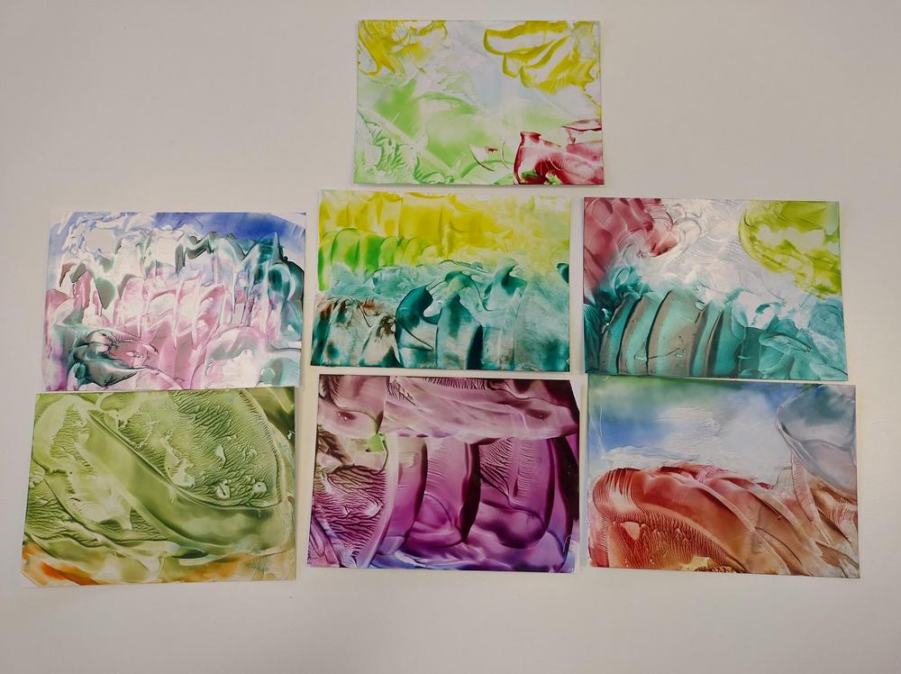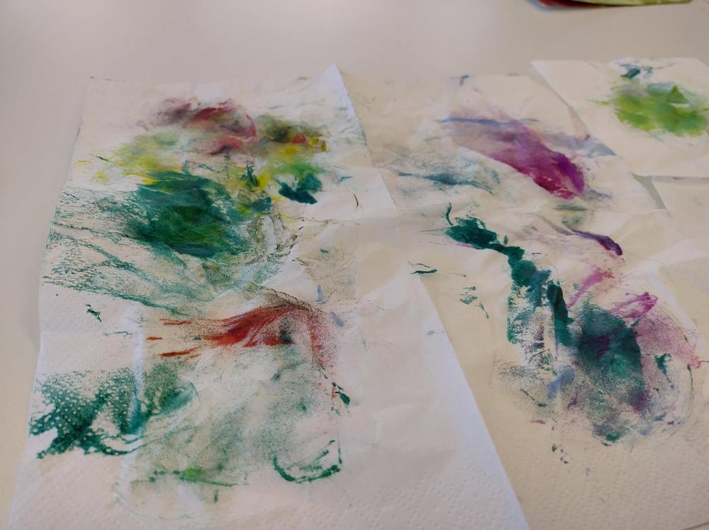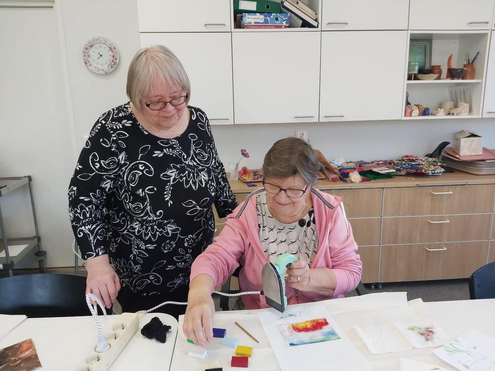 14.5. opettelimme 3 naisen voimin mehiläivahamaalausta. Saimme aikaan melkoista ´taidetta'.
