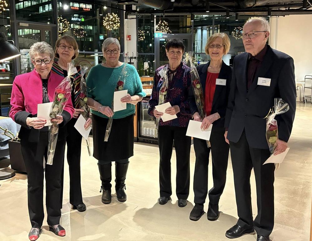 Tilaisuudessa jaettiin Senioriliiton pronssiset ansiomerkit kuudelle pitkäaikaiselle aktiiviselle jäsenellemme. Kaksi poissa ollutta saavat merkkinsä myöhemmin.