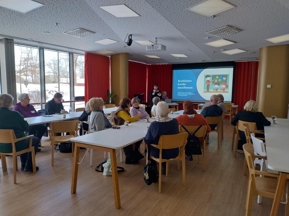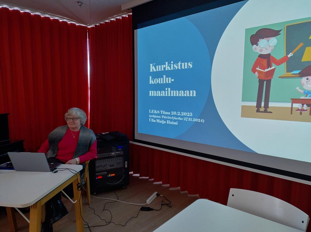 Tiimassa 20.2.2025 yhdistyksen tiedottaja Ulla-Maija Haimi kertoi koulumaailman muutoksista hänen kansa- ja oppikouluajoistaan nykypäivän kouluihin.