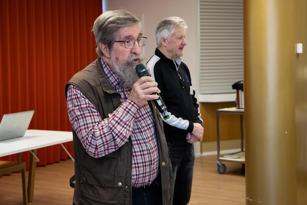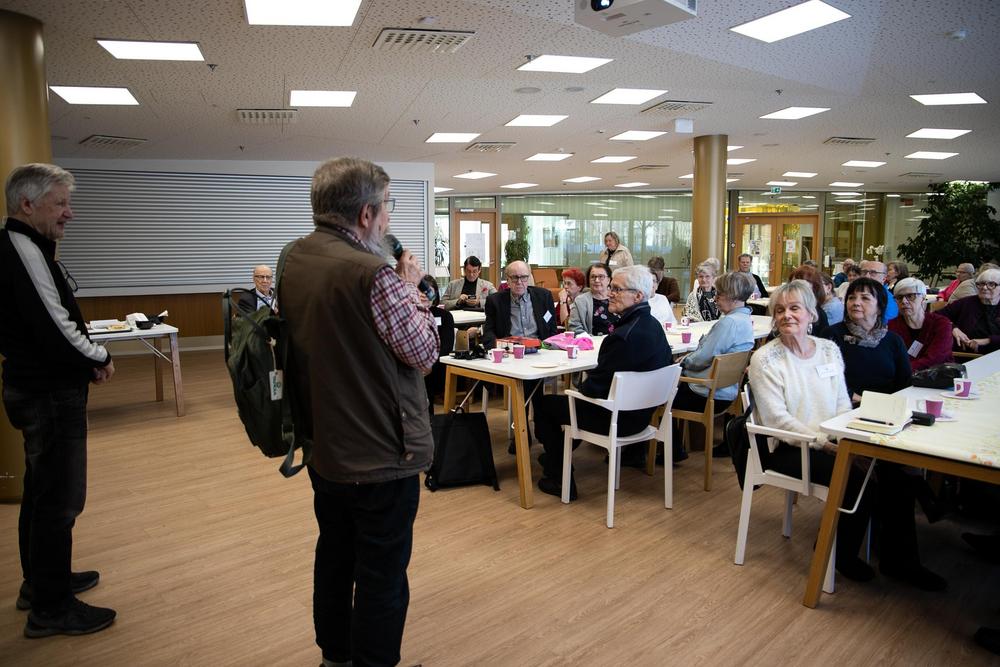 Pentti Mikkonen ja Tapiolan yhdistyksen puheenjohtaja Ismo Nuuja kertoivat tulevasta linturetkestä Villa Elfvikiin keskiviikkona 24.4.2024.