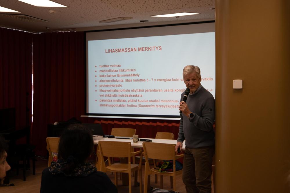 Tiimassa 22.2.2024 yhdistyksemme jäsen FM Pentti Mikkonen kertoi Lihaskadosta eli sarkopeniasta. Sitä voi ehkäistä voimaharjoittelulla.