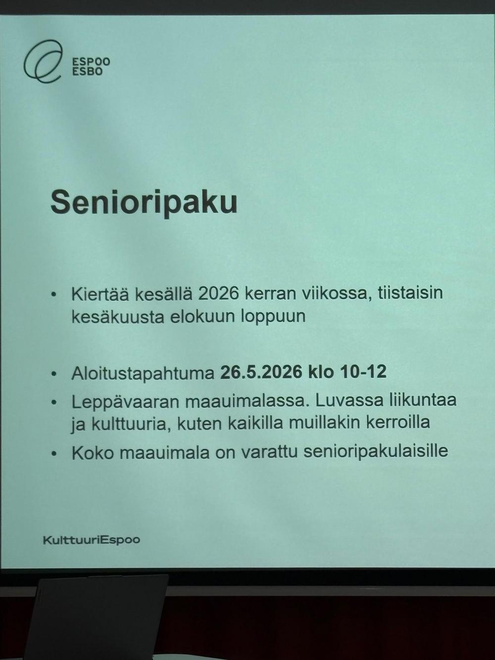 Tiimassa 19.2.2026 oli aiheena "Kulttuuripalvelut ikääntyneille". Niistä kertoi Elina Pulli, erityisasiantuntija Espoon kaupungilta. Kuulimme useasta mielenkiintoisesta meneillään olevasta hankkeesta, joista harva kuulija tiesi ennestään. Nyt tiedämme!